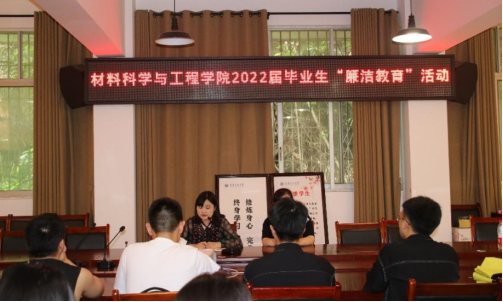 昔来兮,桃李累累;今往兮,杨柳依依。在六月毕业之际,为加强毕业生廉洁教育,让青春焕发绚丽光彩,让廉洁成为青春庄严底色, 15日下午新葡萄8883官网AMG在南岸校区学院会议室开展2022届毕业生“廉洁教育”活动。活动由学工办主任胡纯主持,院党委副书记黄丽君、学院毕业生参会。