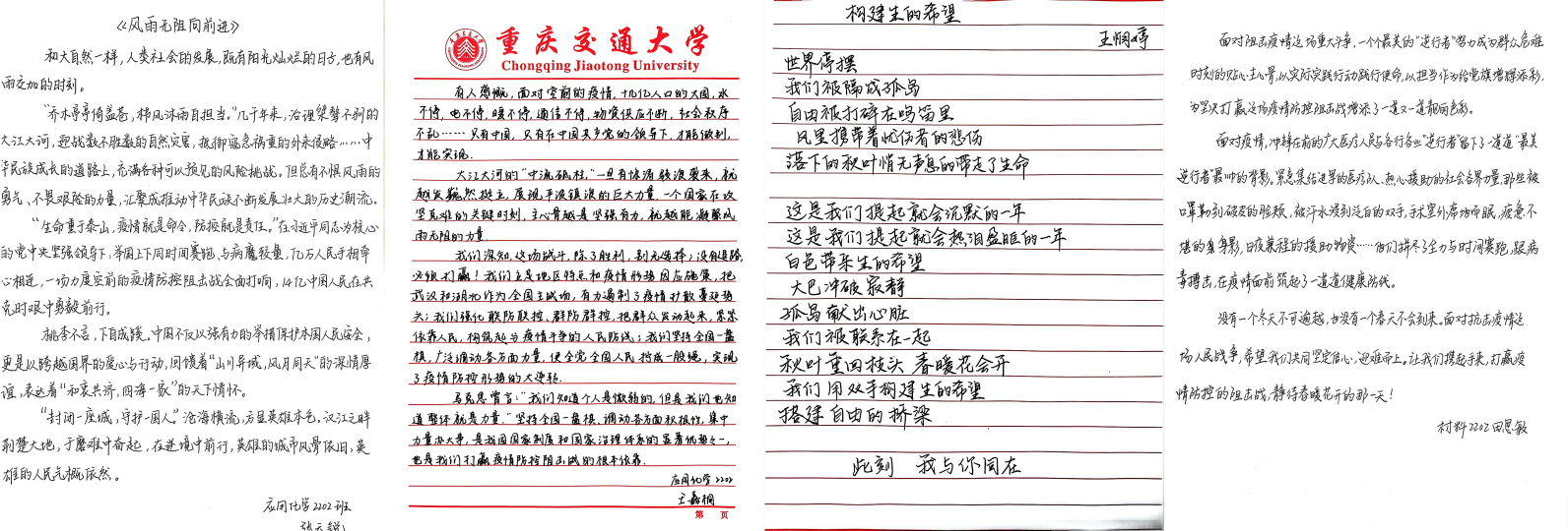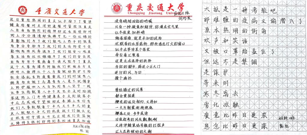 本次比赛面向重庆交通大学全体在校学子,并开通第二课堂提交以及邮箱提交渠道,满足不同同学的投稿需求,征稿期间大家积极响应,纷纷递交作品,以高度的责任感和使命担当,精心创作出以抗击疫情为主题的书法作品,用笔墨凝聚正能量,为抗击疫情贡献力量。