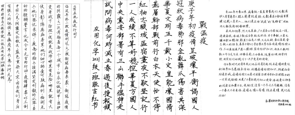 其中,2021级应用化学专业潘雨桐的作品围绕抗击疫情时展开,以一句“因为我们身后有强大的祖国,愿温疫早去,愿山河无恙。”向所有人呐喊出心中美好的祝愿,激励同学们坚定信念,以实际行动共同保卫我们的家园。2021级眭吉红的作品整体浑厚端正,字体气势恢宏,骨力遒劲而气概凛然,字里行间厚重雄浑,大气脱俗,将疫情期间各防疫人员的工作身影带至眼前。