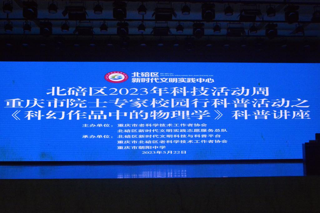 在2023年重庆市科技活动周期间,5月22日下午,我校新葡萄8883官网AMG教师,重庆物理学会、交通与应用物理专委会会员,重庆市院士专家科普讲师团专家赵瑞强副教授,应北碚区老科协和重庆市朝阳中学邀请,在朝阳中学树人报告厅为该校600余名高中生和部分教师做题为《科幻作品中的物理学》科普讲座。讲座由北碚区老科协副会长兼秘书长马狄飞主持。