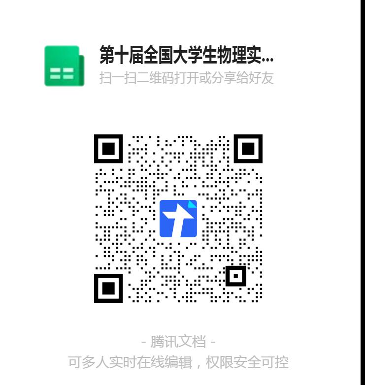 即日起至2024年4月30日,扫码填写《2024年全国大学生物理实验竞赛(创新赛)校内报名表》。https://docs.qq.com/sheet/DWnBhak1ycE96d2da,请加入竞赛QQ群(485350692),并按照“年级-专业-姓名”格式修改昵称,如22材料王三,竞赛后继相关事项均将在QQ群内发布。