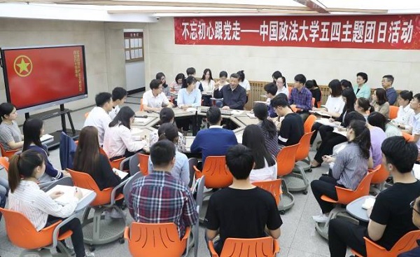 在学生活动中心一层大厅,民商经济法学院本科二年级2班团支部正在开展“不忘初心跟党走”主题团日活动。习近平来到他们中间,同学们报以热烈掌声。几位同学从不同角度畅谈观看电影《焦裕禄》的体会,习近平认真倾听,并参与讨论。习近平语重心长地对同学们说,新中国成立以来,我们党和人民一路筚路蓝缕、艰苦奋斗走来,使国家越来越富强、民族越来越兴盛、人民越来越幸福,其中很重要的一条就是有无数焦裕禄这样的优秀党员、干部为党和人民无私奉献。焦裕禄同志的事迹归结到一点,就是坚定跟党走,他一生都在为党分忧、为党添彩。焦裕禄精神跨越时空,永远不会过时,我们要结合时代特点不断发扬光大。希望大家矢志不渝,用一生来践行跟党走的理想追求。共青团是党的助手和后备军,要始终保持先进性,广大团员青年坚定跟党走,就是初心。不忘这个初心,是我国广大青年的政治选择,也是我国广大青年的人生航向。习近平勉励同学们珍惜韶华,潜心读书,敏于求知,做到德智体美全面发展,毕业后为祖国和人民施展自己的才华,实现自己的人生价值。