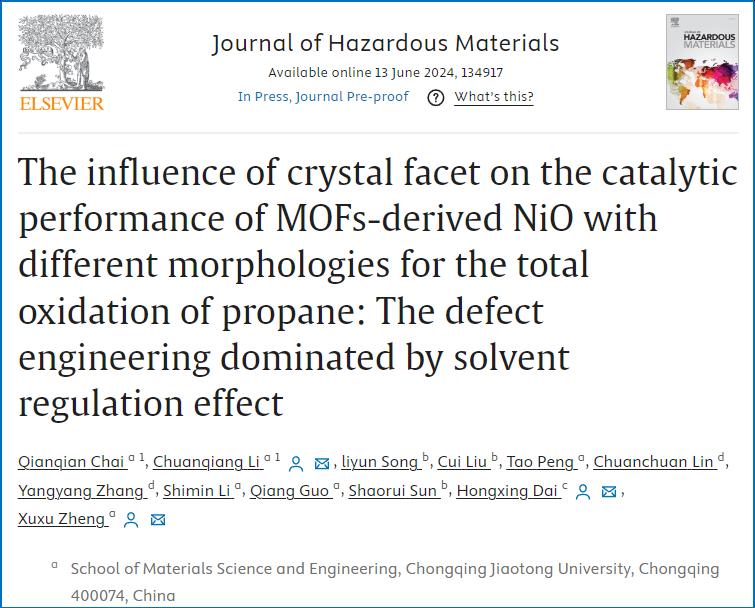 近期,新葡萄8883官网AMG科研团队在国际期刊《Journal of Hazardous Materials》上发表了题为“The influence of crystal facet on the catalytic performance of MOFs-derived NiO with different morphologies for the total oxidation of propane: The defect engineering dominated by solvent regulation effect”的科技论文。《Journal of Hazardous Materials》为材料领域顶级期刊(SCI一区,TOP),影响因子13.6。该论文的第一作者为我院在读硕士研究生柴倩倩,通讯作者为我校郑旭煦教授和李传强教授。