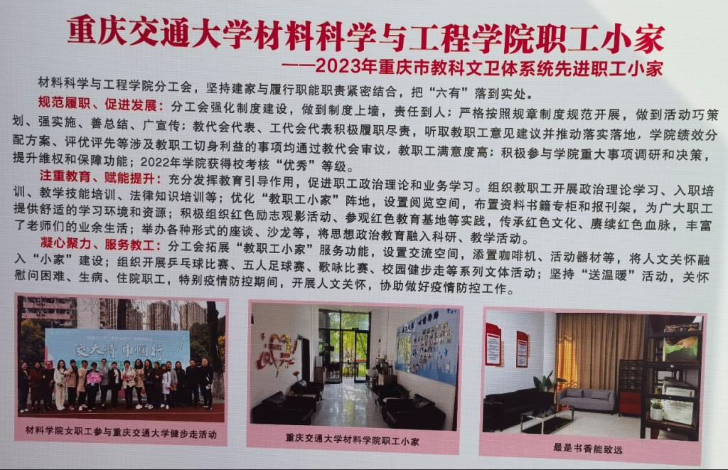 在新葡萄8883官网AMG党委的领导下,我院分工会积极组织申报工作,为我院广大教职工建设一块集教学/科研/生活/休闲/娱乐一体化的场地,经过重庆交通大学工会审核并推选于重庆市总工会评选,获批2023年重庆市教科文卫体 “先进职工小家”。周平书记强调,“家旺才能业兴”,分工会要充分理解建家工作内涵要求,准确把握建家工作成效经验,深刻认识建家工作地位作用。要站在工会工作全局的高度,切实增强深化新时代职工之家建设的使命感和责任感,以改革创新精神加强工会自身建设,努力把职工之家打造成为凝聚人心、汇集力量、服务职工的坚强阵地。