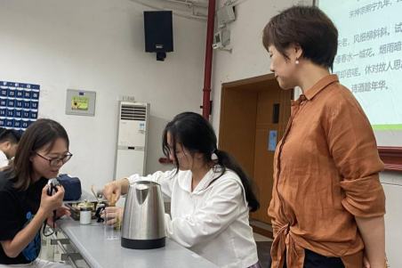 苏东坡对生活的热忱体现在他一丝不苟追求美好的细节上,金老师详细介绍了其中的一种:“点茶”文化,并现场带同学们体验了宋人的“点茶”时刻,邀请学生亲自体验,与老师一起细细感受来自宋朝的浪漫,体味生活中容易被忽视的“慢”之美。