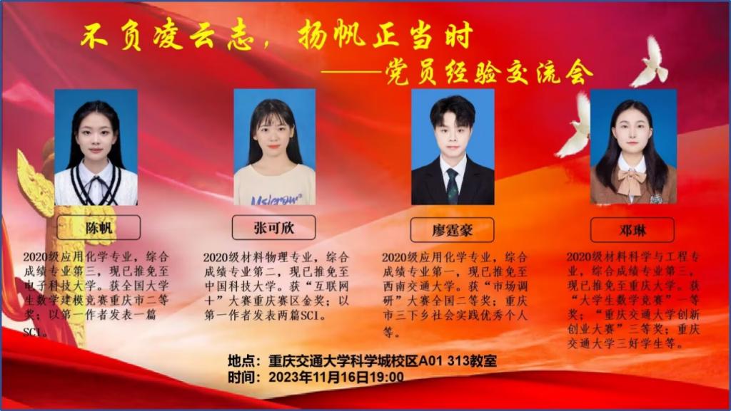 交流会上,四位毕业生党员分别就自己的经历经验向同学们进行了分享。党员代表陈帆着重分享了自己在科研竞赛部分的相关经验,她表示同学们一定要主动地联系从事自己感兴趣领域工作的老师,并与老师多沟通交流,坚定地跟随在老师的指导下。”党员代表廖霆豪与张可欣则将社会实践与青年成长成才需求点相结合,强调道,社会实践是同学们了解社会的一种方式,希望同学们能够深入相关社会实践领域,树立正确择业观,坚定立大志、入主流、上大舞台、干大事业的决心。