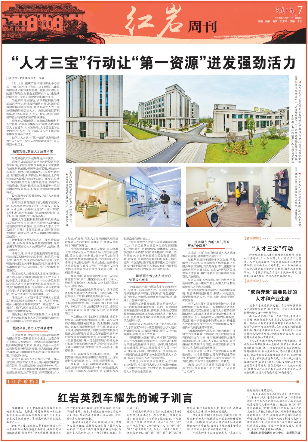 3月21日《重庆日报》报道了沙坪坝“人才三宝”行动让“第一资源”迸发强劲活力。